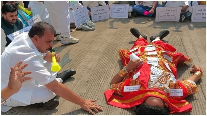 आज महिदपुर के कांग्रेस विधायक दिनेश जैन बोस कुंभकरण के वेश में विधानसभा पहुंचे। उन्होंने सड़क पर लेटकर सरकार पर परिवहन घोटाले, बेरोजगारी औ किसानों के मुद्दे पर चुप्पी साधने का आरोप लगाया। नेता प्रतिपक्ष उमंग सिंघार और कांग्रेस के विधायकों ने पुंगी बजाकर उन्हें उठाने की कोशिश की। करीब दस मिनट तक बीन बजाने के बाद भी कुंभकरण नहीं जागा तो नेता प्रतिपक्ष उमंग सिंघार ने अलग से प्रयास किए, तब जाकर कुंभकरण नींद से जागा। उसके जागने के बाद नेता प्रतिपक्ष ने कुंभकरण से पूछा कि क्यों नहीं जाग रहे थे, तब उसने खुद को सरकार बताते हुए कहा कि मेरी जब इच्छा होगी तभी जागूंगा। इस प्रदर्शन के बाद नेता प्रतिपक्ष उमंग सिंघार ने कहा कि सरकार कुंभकरण की नींद सो रही है और प्रदेश में घोटाले पर घोटाले हो रहे हैं। इसलिए इस प्रकार से नाटक कर सरकार को जगाने का प्रयास किया गया है।