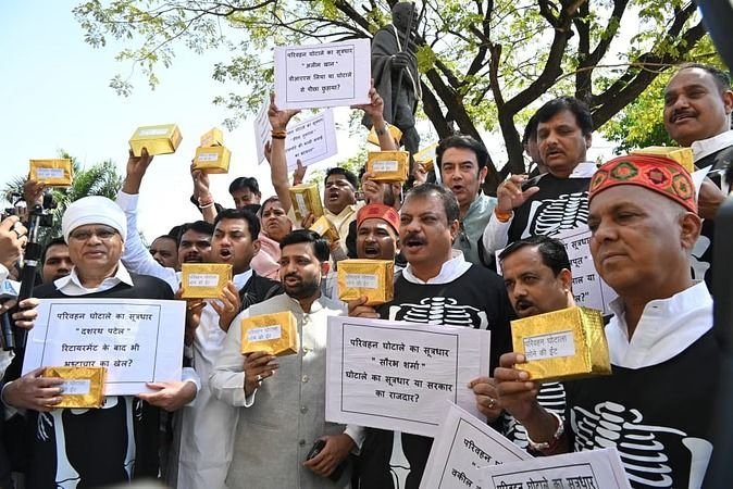 भोपाल। मध्यप्रदेश विधानसभा के बजट सत्र के दौरान कांग्रेस ने आज परिवहन घोटाले के विरोध में प्रदर्शन किया। विधानसभा परिसर में गांधी प्रतिमा के सामने नेता प्रतिपक्ष उमंग सिंघार समेत कांग्रेस के विधायक अपने हाथों में प्रतीकात्मक सोने की ईंट लेकर पहुंचे। विधायकों ने ऐसे कपड़े पहन रखे थे, जिस पर कंकाल का फोटो था।