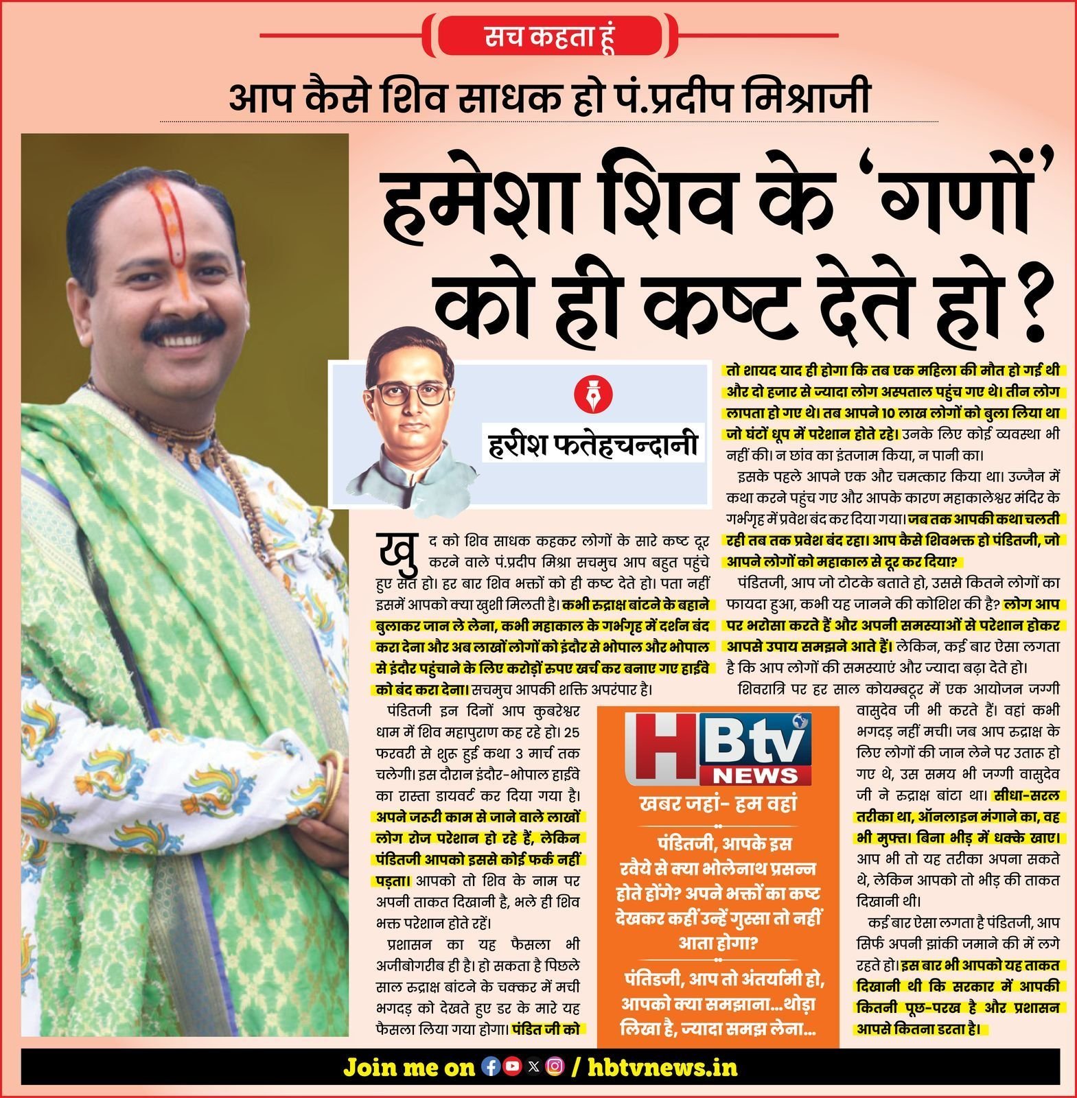 पंडितजी इन दिनों आप कुबरेश्वर धाम में शिव महापुराण कह रहे हो। 25 फरवरी से शुरू हुई कथा 3 मार्च तक चलेगी। इस दौरान इंदौर-भोपाल हाईवे का रास्ता डायवर्ट कर दिया गया है। अपने जरूरी काम से जाने वाले लाखों लोग रोज परेशान हो रहे हैं, लेकिन पंडितजी आपको इससे कोई फर्क नहीं पड़ता। आपको तो शिव के नाम पर अपनी ताकत दिखानी है, भले ही शिव भक्त परेशान होते रहें।