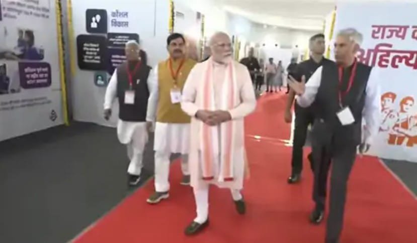 प्रधानमंत्री नरेंद्र मोदी आयोजन स्थल पर खुली चीप से पहुंचे, जहां उनका जोरदार स्वागत किया गया। इसके महिलाओं ने आयोजन स्थल पर लगी प्रदर्शन का अवलोकन किया और वहां उपस्थित महिलाओं से बातचीत की। इसके बाद पीएम ने माता देवी अहिल्या की प्रतिमा पर माल्यर्पण किया। उनके साथ सीएम डॉ.मोहन यादव भी थे। इस अवसर पर सीएम डॉ.मोहन यादव ने देवी अहिल्या के बारे में जानकारी दी। इसके साथ ही देवी अहिल्या के 300 वीं जयंती पर प्रदेश में चलाए जा रहे कार्यक्रमों की जानकारी दी।