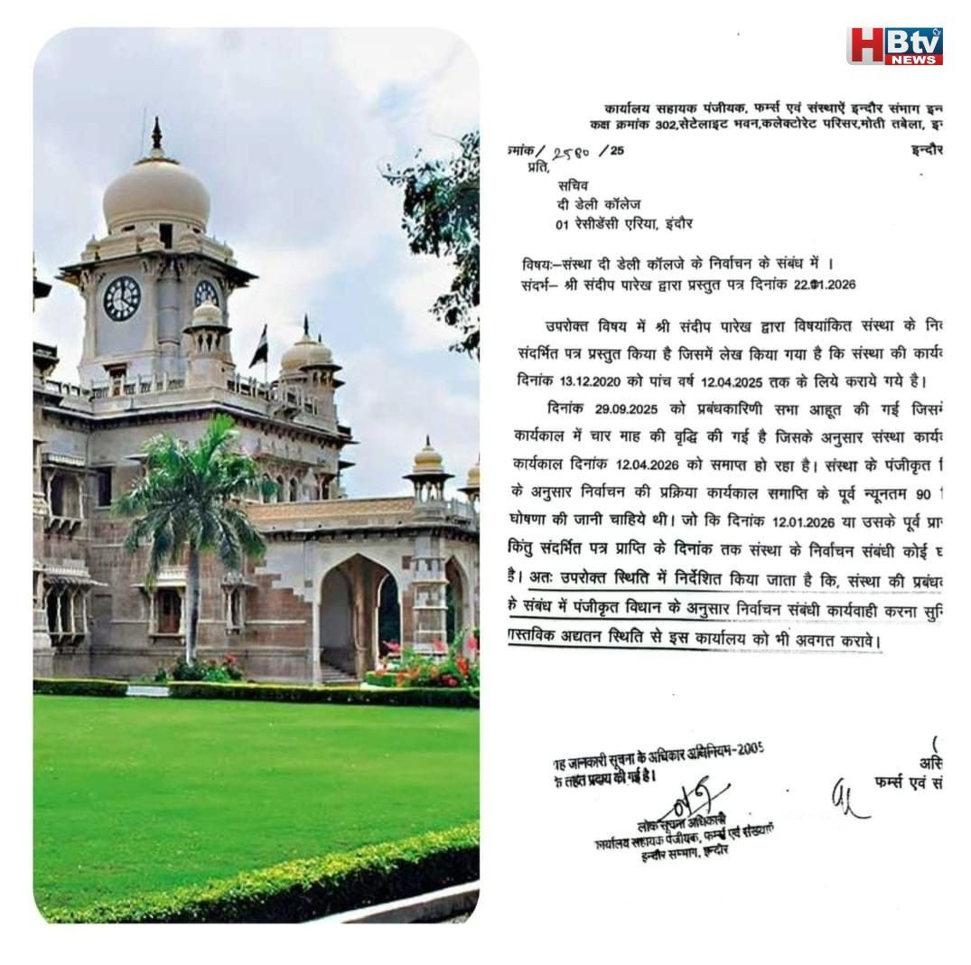 फर्म्स एवं संस्थाएं के सहायक पंजीयक बीडी कुबेर ने यह नोटिस भेजा है। डेली कॉलेज के सचिव को संबोधित इस नोटिस में कहा गया है कि संदीप पारेख द्वारा संस्था के चुनाव के संबंध में संदर्भ में पत्र भेजा है। लिखा है कि संस्था की कार्यकारिणी का निर्वाचन 13 दिसंबर 2020 को 12 अप्रैल 2025 तक के लिये कराए गए हैं। 29 सितंबर को 2025 को प्रबंधकारिणी सभा बुलाई गई थी। इसमें कार्यकारिणी के कार्यकाल में चार माह की वृद्धि की गई है। इसके अनुसार संस्था कार्यकारिणी समिति का कार्यकाल 12 अप्रैल 2026 को समाप्त हो रहा है।