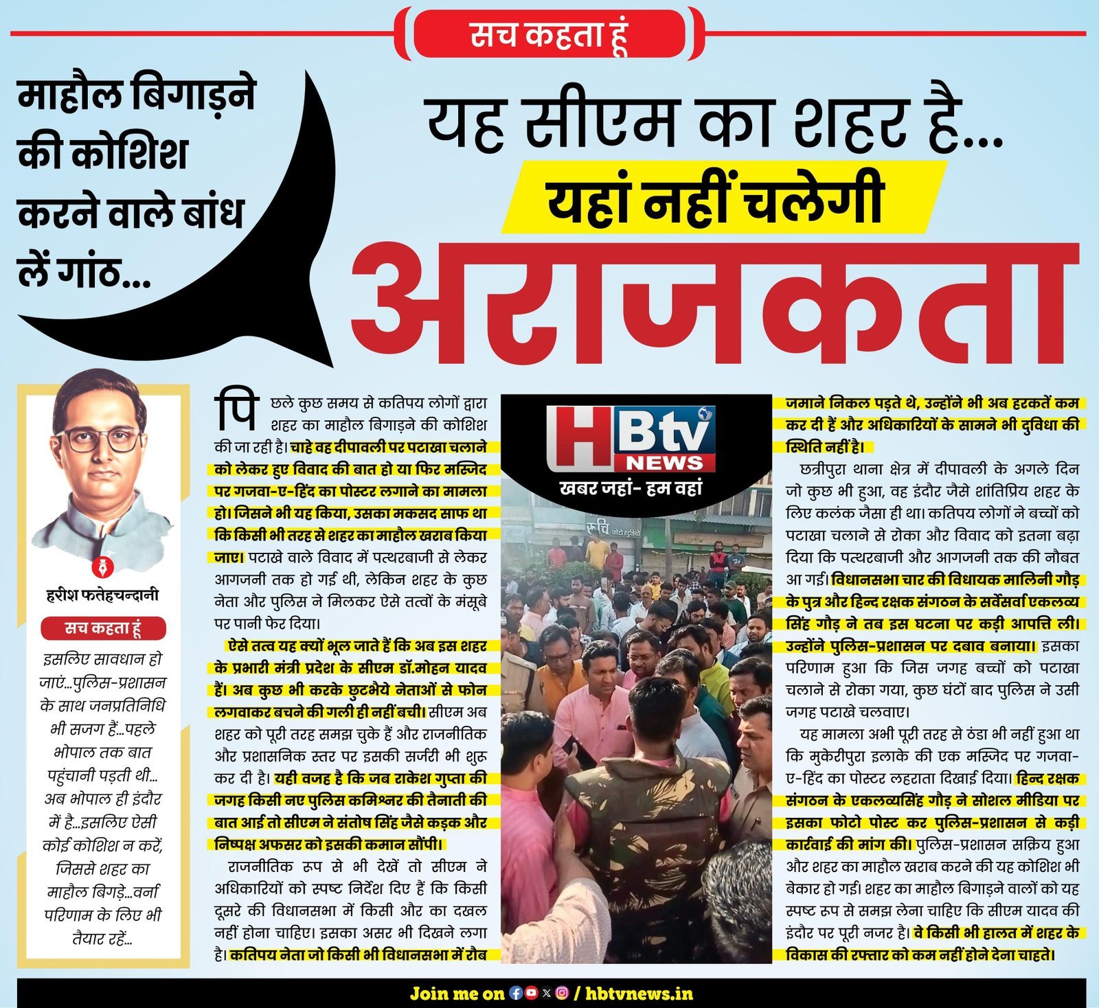 शहर का माहौल बिगाड़ने वालों को यह स्पष्ट रूप से समझ लेना चाहिए कि सीएम यादव की इंदौर पर पूरी नजर है। वे किसी भी हालत में शहर के विकास की रफ्तार को कम नहीं होने देना चाहते।