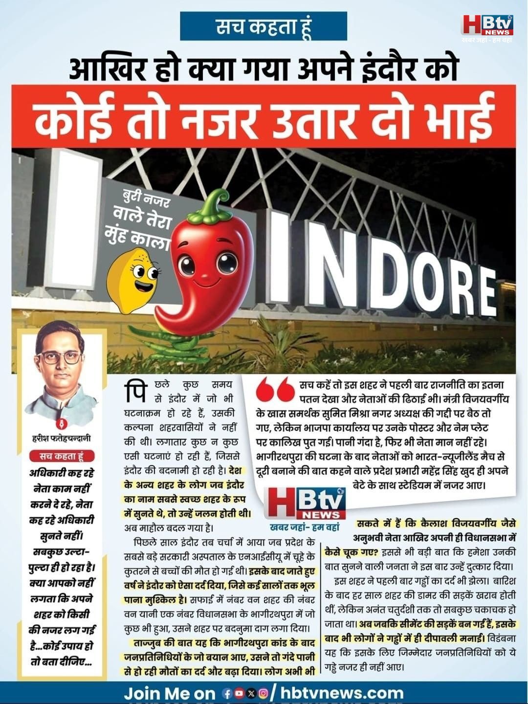 सच कहें तो इस शहर ने पहली बार राजनीति का इतना पतन देखा और नेताओं की ढिठाई भी। मंत्री विजयवर्गीय के खास समर्थक सुमित मिश्रा नगर अध्यक्ष की गद्दी पर बैठ तो गए, लेकिन भाजपा कार्यालय पर उनके पोस्टर और नेम प्लेट पर कालिख पुत गई। पानी गंदा है, फिर भी नेता मान नहीं रहे। भागीरथपुरा की घटना के बाद नेताओं को भारत-न्यूजीलैंड मैच से दूरी बनाने की बात कहने वाले प्रदेश प्रभारी महेंद्र सिंह खुद ही अपने बेटे के साथ स्टेडियम में नजर आए।