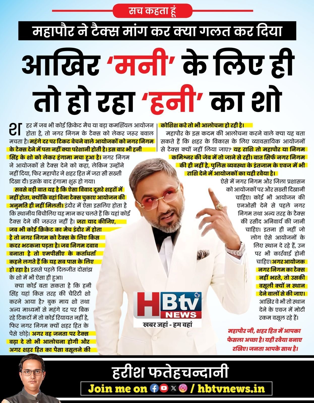 क्या कोई बता सकता है कि हनी सिंह यहां किस तरह की चैरिटी शो करने आया है? बुक माय शो तथा अन्य माध्यमों से महंगे दर पर बिक रहे टिकटों में तो कोई रियायत नहीं है, फिर नगर निगम क्यों शहर हित के पैसे छोड़े। अगर वह जनता पर टैक्स बढ़ा दे तो भी आलोचना होगी और अगर शहर हित का पैसा वसूलने की कोशिश करे तो भी आलोचना हो रही है।