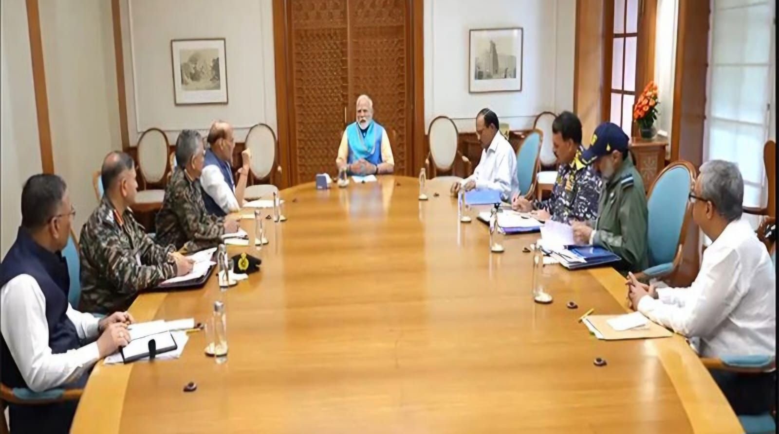 प्रधानमंत्री नरेंद्र मोदी ने ऑपरेशन सिंदूर को लेकर शनिवार को एक बैठक की। इसमें रक्षा मंत्री राजनाथ सिंह, राष्ट्रीय सुरक्षा सलाहकार अजीत डोभाल, चीफ ऑफ डिफेंस स्टाफ जनरल अनिल चौहान, वायु सेना प्रमुख एयर चीफ मार्शल एपी सिंह, थल सेना प्रमुख जनरल उपेंद्र द्विवेदी और नौसेना प्रमुख एडमिरल दिनेश कुमार त्रिपाठी शामिल रहे? यह मीटिंग ऐसे समय में हुई जब भारत ने पाकिस्तान के ड्रोन हमलों को पूरी तरह से नाकाम कर दिया है। माना जा रहा है कि प्रधानमंत्री मोदी को इस दौरान पाकिस्तान के जरिए किए गए हमले, भारतीय सेना की जवाबी कार्रवाई और सैन्य तैयारियों की पूरी जानकारी दी गई। पिछले 24 घंटे में प्रधानमंत्री मोदी की सेना प्रमुखों और रक्षा मंत्री राजनाथ सिंह के साथ यह दूसरी और महत्वपूर्ण बैठक है।