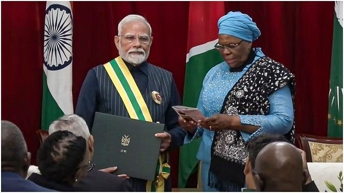 नई दिल्ली। प्रधानमंत्री नरेंद्र मोदी को नामीबिया के सर्वोच्च नागरिक सम्मान से नवाजा गया है। पीएम मोदी को बुधवार को नामीबिया का सर्वोच्च नागरिक सम्मान ‘ऑर्डर ऑफ द मोस्ट एंशिएंट वेल्वित्चिया मिराबिलिस‘ से सम्मानित किया गया। यह सम्मान उन्हें नामीबिया की राष्ट्रपति डॉ. नेटुम्बो नंदी–नदैतवाह ने दिया।