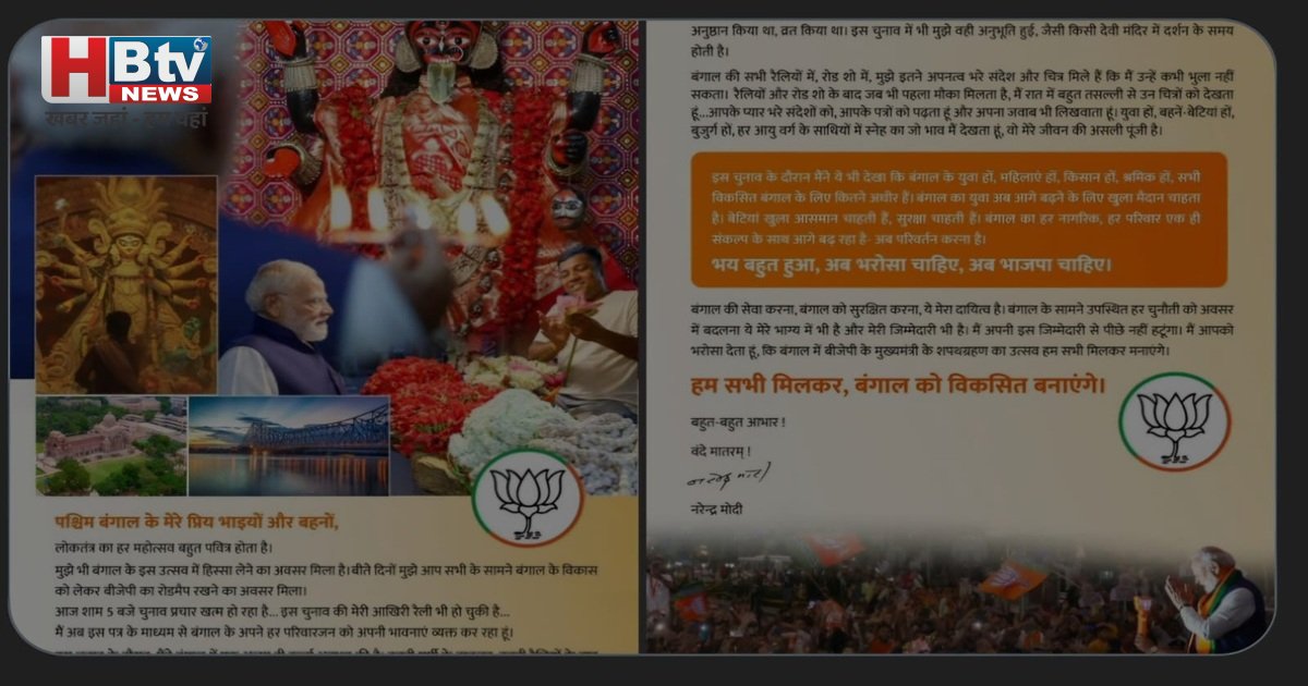 पीएम मोदी ने अपने पत्र में कहा कि मैं इस पत्र के माध्यम से बंगाल के अपने हर परिवारजन को अपनी भावनाएं व्यक्त कर रहा हूं। उन्होंने कहा कि बंगाल का हर नागरिक, हर परिवार एक ही संकल्प के साथ आगे बढ़ रहा है – अब परिवर्तन करना है। भय बहुत हुआ, अब भरोसा चाहिए, अब भाजपा चाहिए।