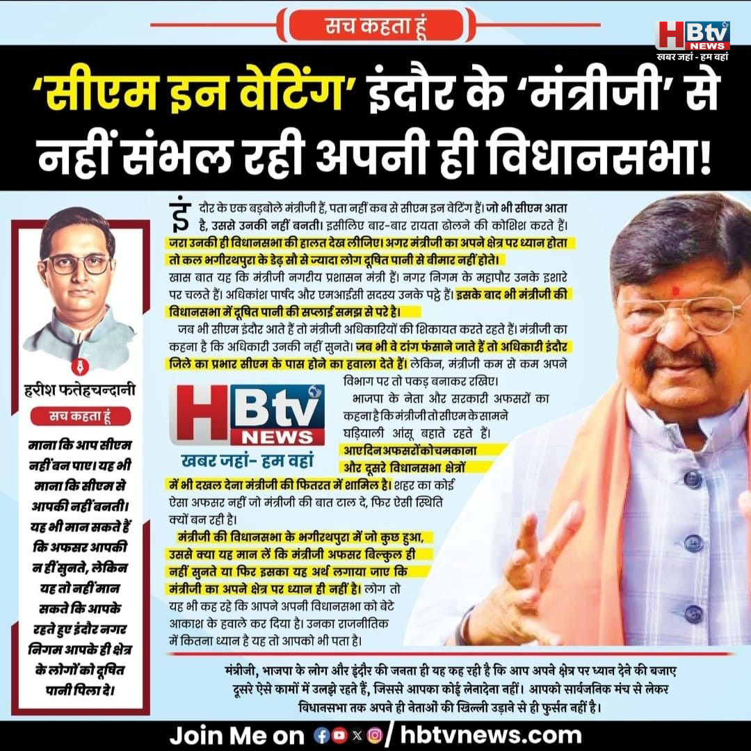 इंदौर के एक बड़बोले मंत्रीजी हैं, पता नहीं कब से सीएम इन वेटिंग हैं। जो भी सीएम आता है, उससे उनकी नहीं बनती। इसीलिए बार-बार रायता ढोलने की कोशिश करते हैं। जरा उनकी ही विधानसभा की हालत देख लीजिए। अगर मंत्रीजी का अपने क्षेत्र पर ध्यान होता तो कल भगीरथपुरा के डेढ़ सौ से ज्यादा लोग दूषित पानी से बीमार नहीं होते।