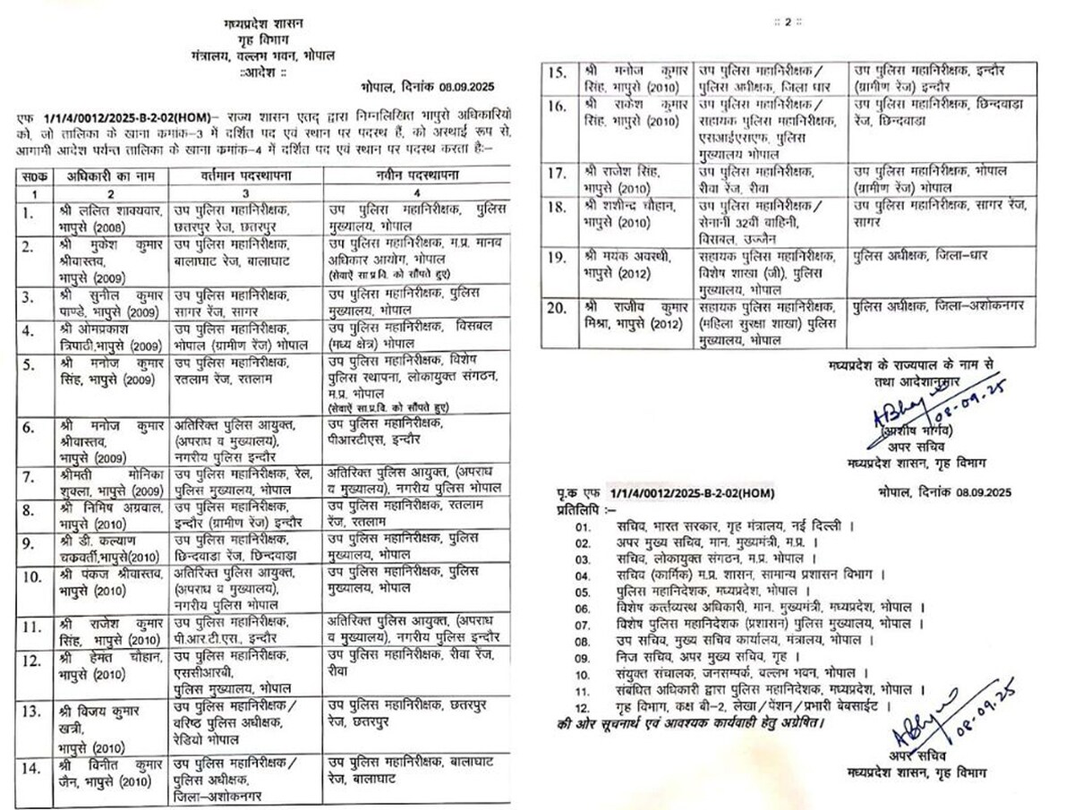 मनोज कुमार सिंह डीआईजी रतलाम की पदस्थापना लोकायुक्त संगठन में डीआईजी के के रूप में की गई है। अतिरिक्त पुलिस आयुक्त (अपराध व मुख्यालय) नगरीय पुलिस इंदौर मनोज कुमार श्रीवास्तव को डीआईजी पुलिस रिसर्च ट्रेनिंग सेंटर इंदौर भेजा गया है। मोनिका शुक्ला डीआईजी रेल, पीएचक्यू को अतिरिक्त पुलिस आयुक्त नगरीय पुलिस भोपाल बनाया गया है। निमिष अग्रवाल डीआईजी इंदौर ग्रामीण को डीआईजी रतलाम रेंज, डी कल्याण चक्रवर्ती डीआईजी छिंदवाड़ा को डीआईजी पीएचक्यू, हेमंत चौहान डीआईजी एससीआरबी पीएचक्यू को डीआईजी रीवा रेंज बनाया गया है।
